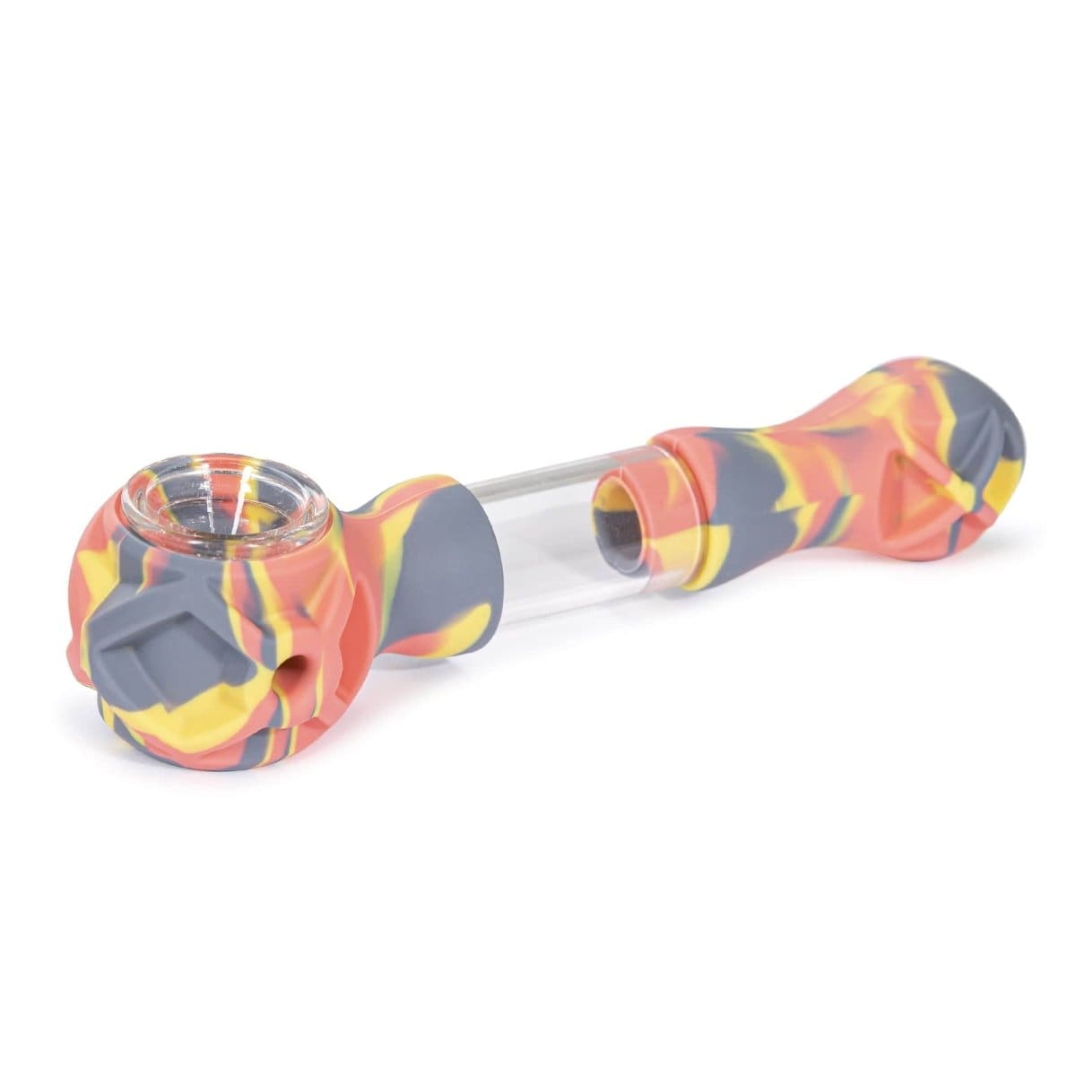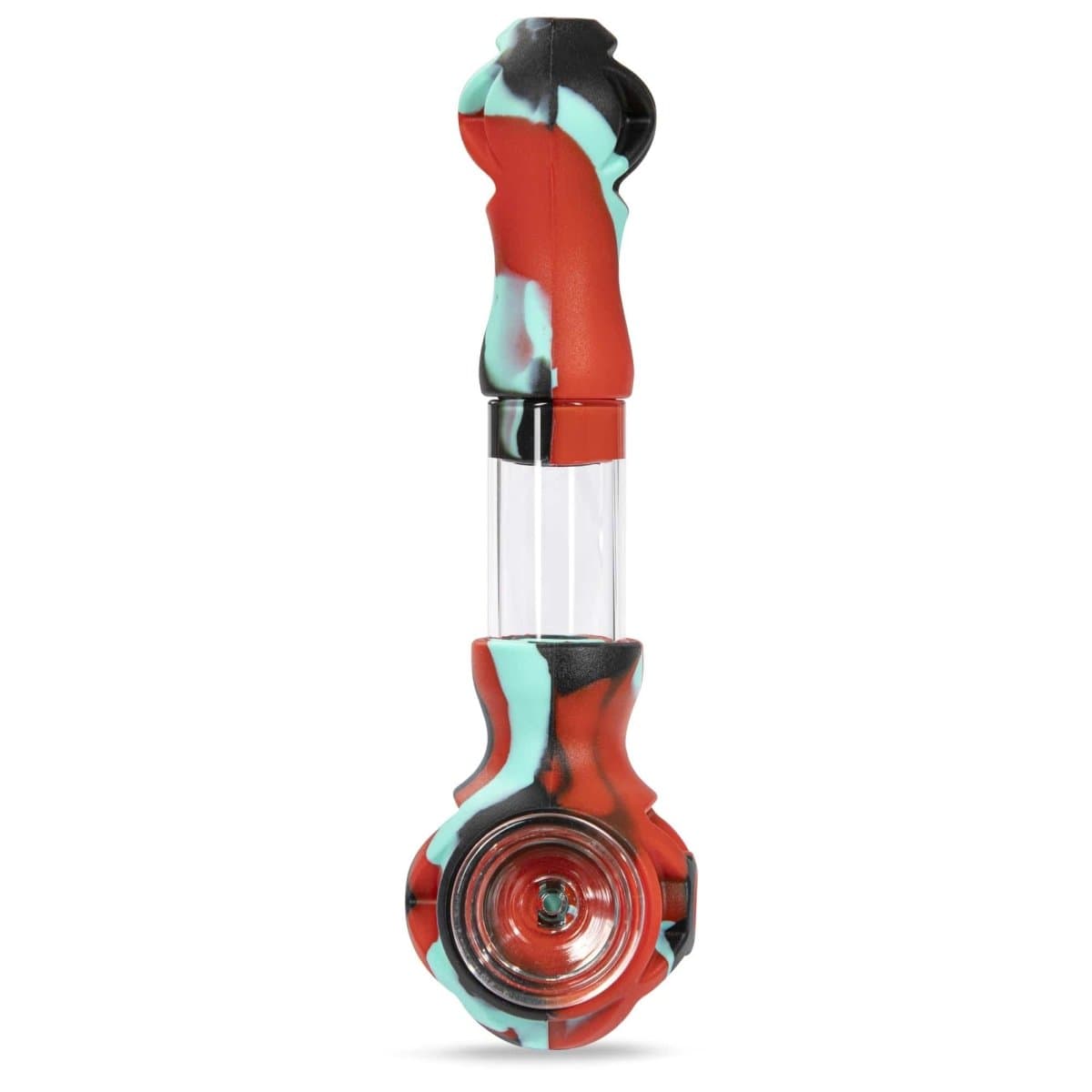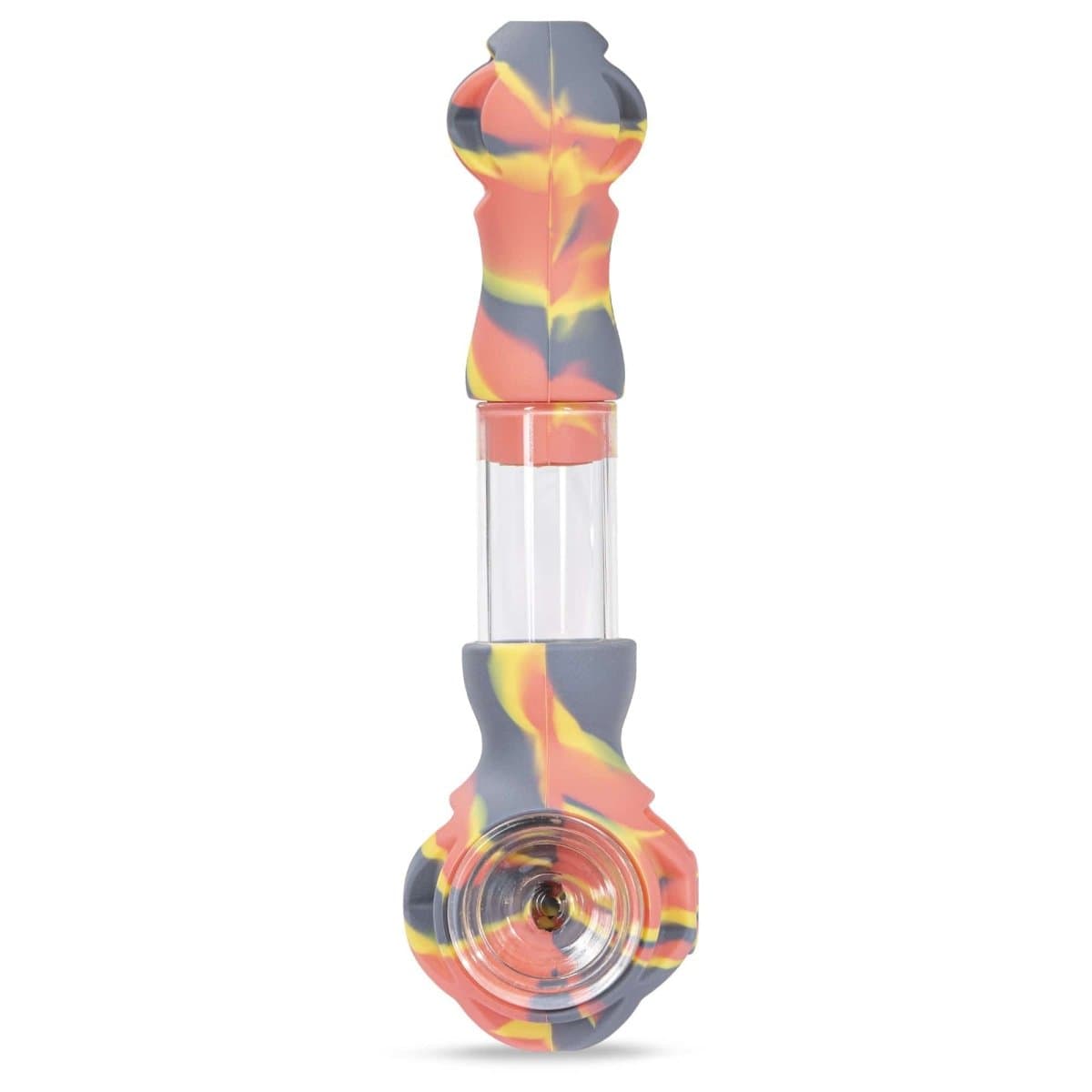 The Hybrid Glass Spoon Pipe is a handheld smoking device that combines silicone and borosilicate glass materials. It features a durable silicone exterior and a nearly indestructible glass chamber and bowl. This unique design allows for a tough outer shell with a delicate, see-through interior.